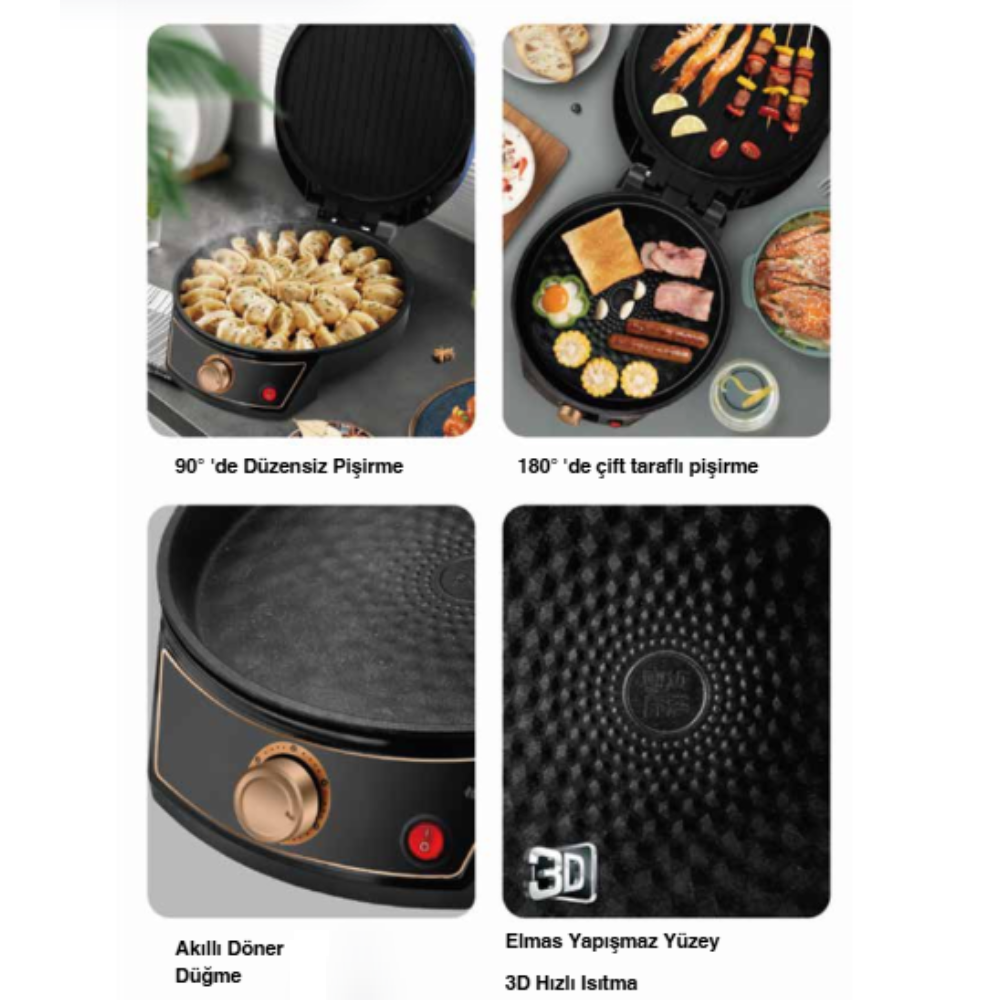 Yanmaz ve yapışmaz özellikteki Granit Görünümlü İç Yüzey, yiyeceklerin yapışmasını engeller ve temizliği son derece kolaylaştırır. Ayarlanabilir termostatı ile yiyeceğin türüne göre (örneğin et için yüksek, ısıtma için düşük) sıcaklığı kontrol edebilirsiniz. Dayanıklı metal kapak yapısı, ısının içeride eşit dağılmasına yardımcı olur.