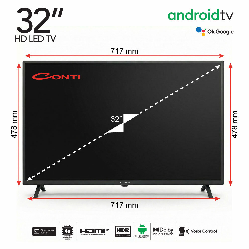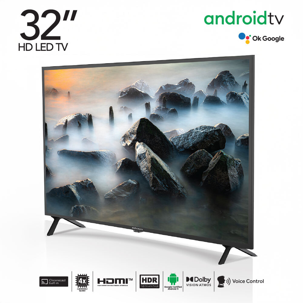 Conti CT32AN300H 32" HD Android Tv, 80 ekranlık (32 inç) ideal boyutu ve akıllı özellikleriyle evinizdeki eğlence anlayışını bir üst seviyeye taşıyor. Lisanslı Android Smart (11.0) işletim sistemi sayesinde en güncel uygulamalara, dizilere ve filmlere tek tıkla ulaşabilirsiniz. HD Ready çözünürlüğü ve LED görüntüleme teknolojisi, canlı renkler ve net detaylar sunarken; güçlü 4 çekirdekli işlemcisi menüler arası akıcı bir kullanım deneyimi sağlar.