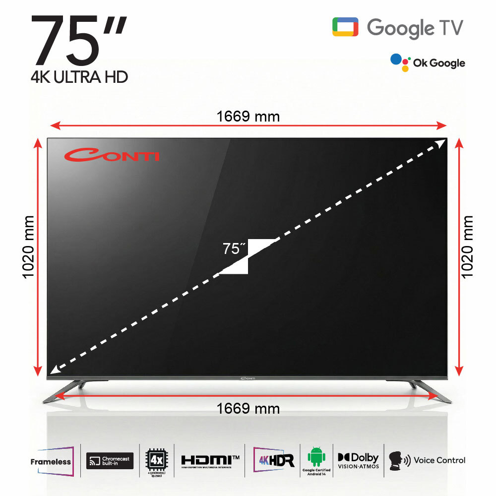 Conti CT75GT300U 75" 4K UHD Frameless Google Tv, 190 ekranlık (75 inç) nefes kesici devasa boyutu ve sınırları kaldıran çerçevesiz (Frameless) tasarımıyla izleme alışkanlıklarınızı baştan yazıyor. 4K Ultra HD (3840 x 2160) çözünürlüğü, bu dev ekranda her ayrıntının, her renk tonunun en doğal ve en keskin haliyle canlanmasını sağlar. İster dev maçları ister gişe rekorları kıran filmleri izleyin, güçlü 2 x 12W Stereo Hoparlör sistemi ile kendinizi her zaman aksiyonun tam merkezinde hissedeceksiniz.